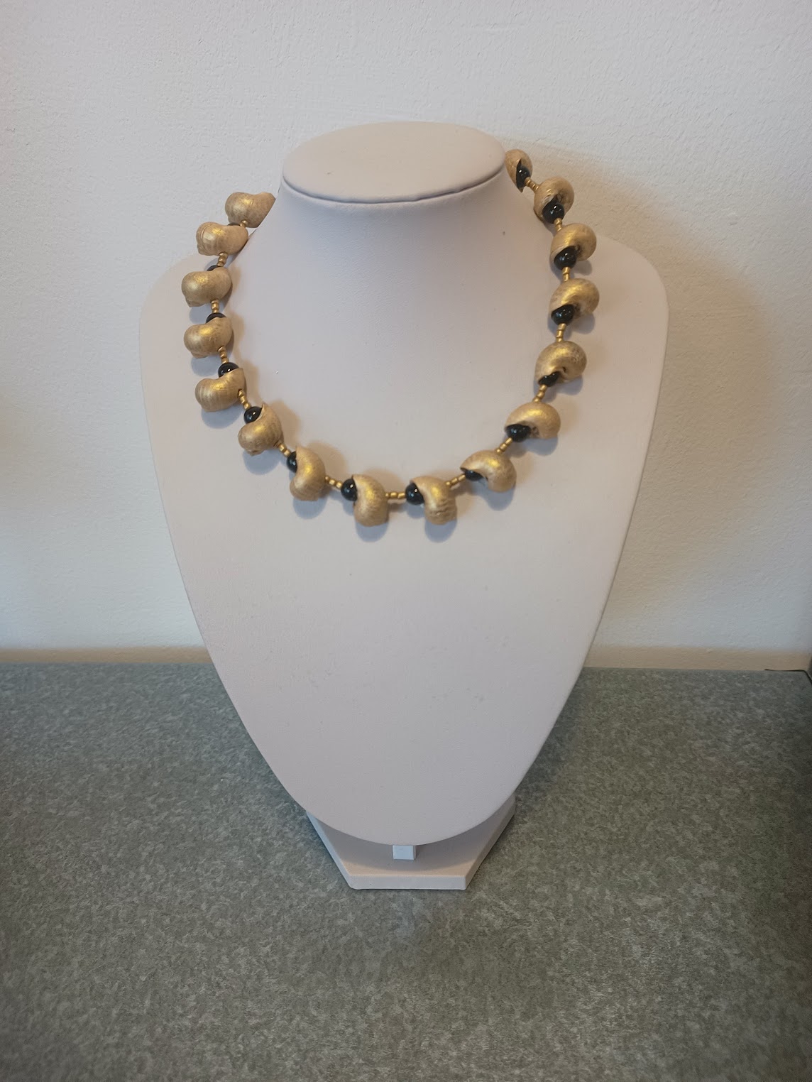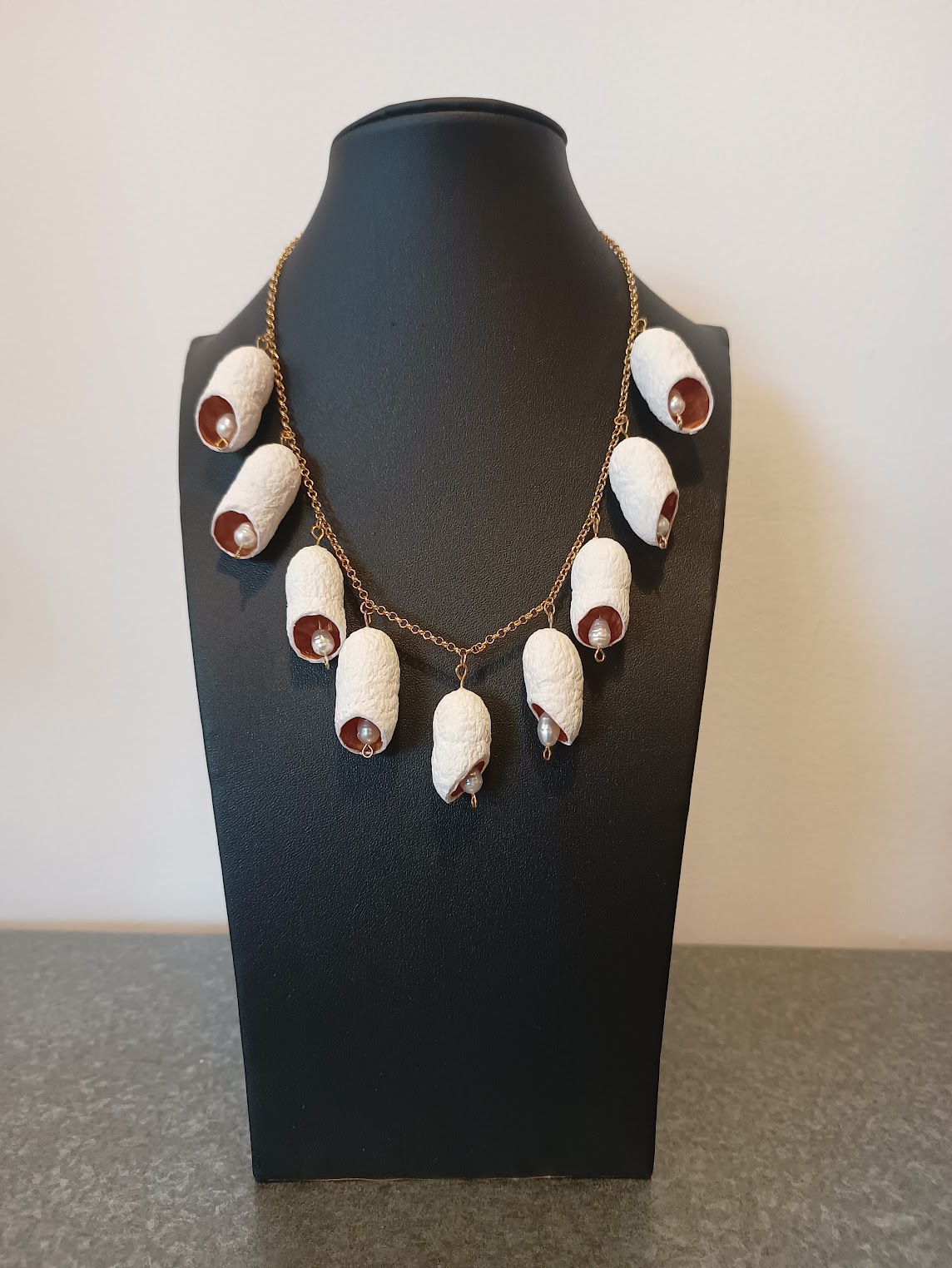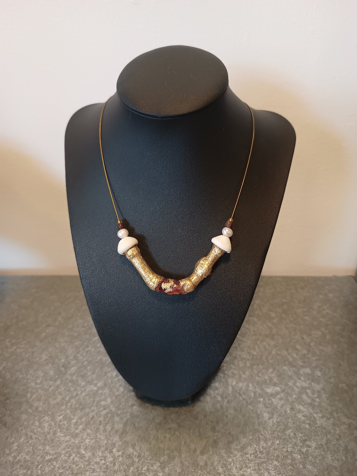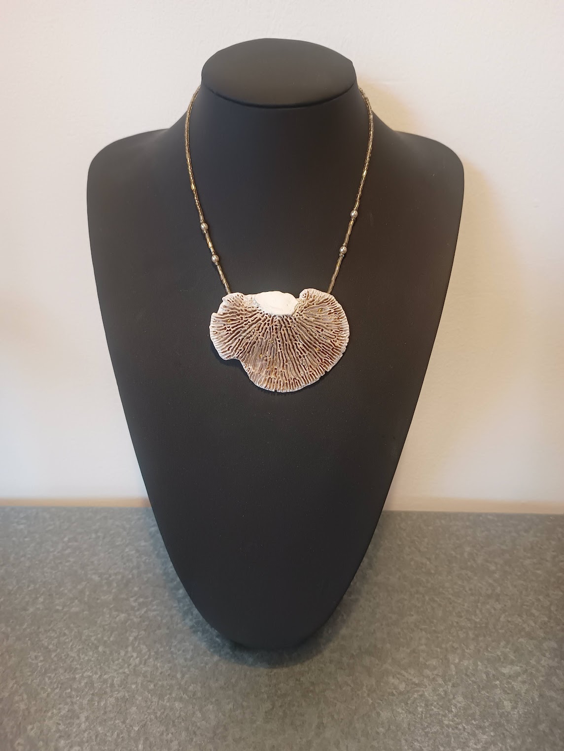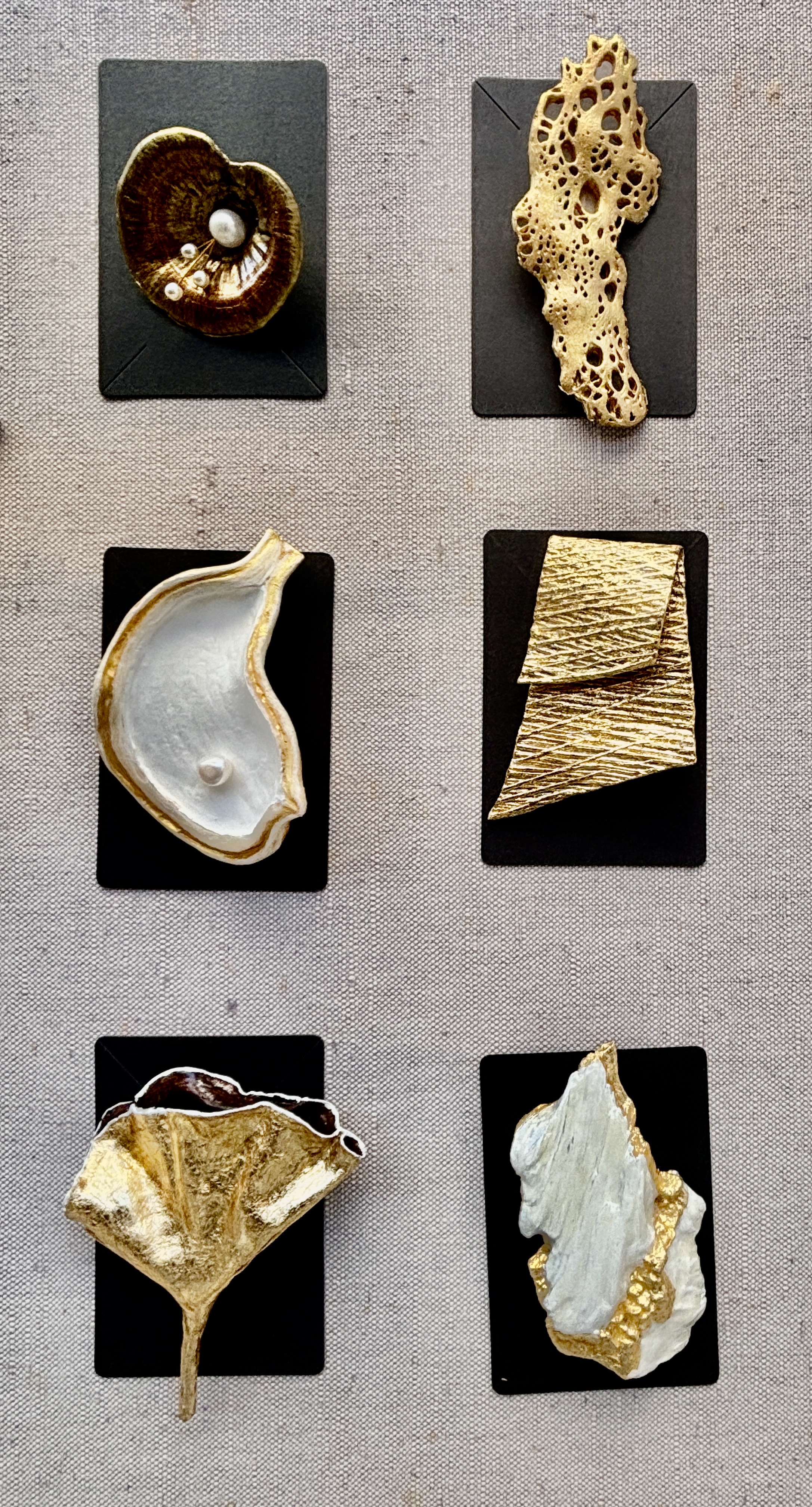 Paddestoelen, noten, takjes, vruchten… Marian prepareert en combineert vondsten uit de natuur tot unieke en tijdloze sieraden. Vaak gebruikt ze daarbij bladgoud en (half-)edelstenen.